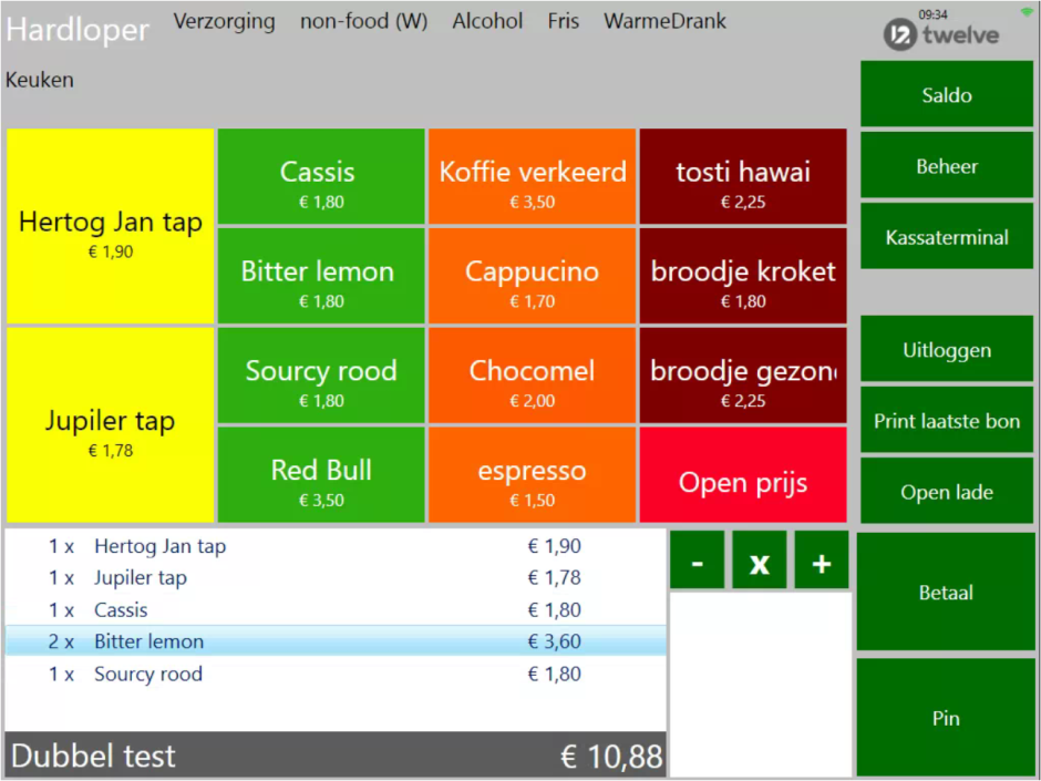 We maken gebruik van het kassasysteem van Twelve met touch-screen. Betalen gaat via de pinautomaat of (nfc) kaartlezer en contant geld wordt niet geaccepteerd.